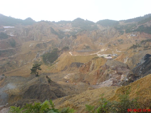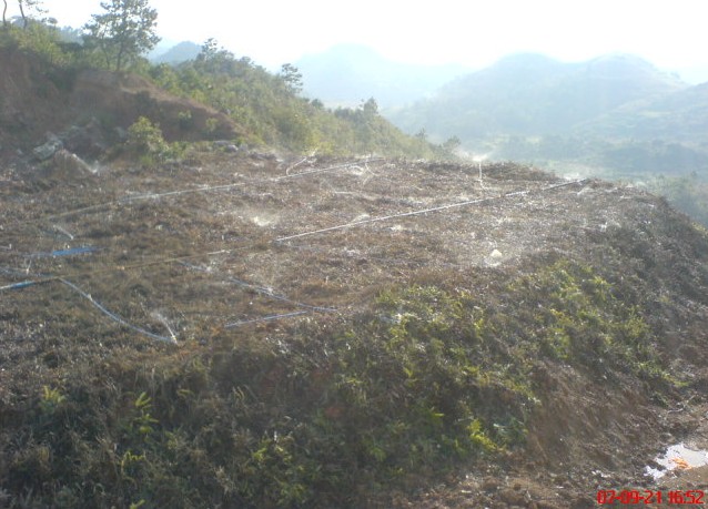 圖解:礦從山上開挖下來(lái)運(yùn)到堆浸場(chǎng)地,數(shù)量隨堆場(chǎng)的大小而定,堆場(chǎng)底部要盡量壓實(shí)不能有石塊等物還要留有2條以上的排水溝,再用彩條布鋪滿,排水溝上架木條和竹籬笆,再堆礦。