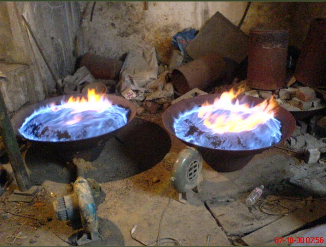 圖解:接下來(lái)是吹鉛步驟,把含鉛黃金放入裝滿水泥的大鍋中,上面放煤球或焦炭,用風(fēng)機(jī)吹然后停止吹風(fēng)使其自然升溫到1300度以上,這是鉛就氣化蒸發(fā),這一過程需要2-3小時(shí)。
