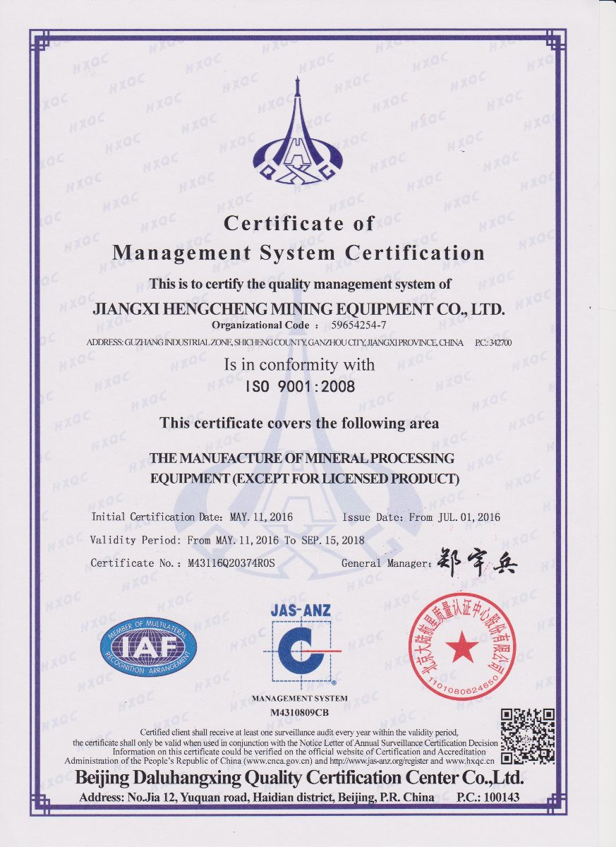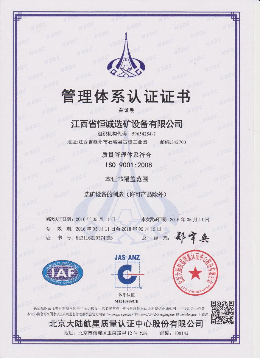 經過北京大陸航星質量認證中心股份有限公司BEIJING DALU HANGXING QUALITY CERTIFICATION CENTER CO.,LTD.的嚴格審核,公司榮獲國家認監委認可ISO9001:2008質量管理體系認證證書